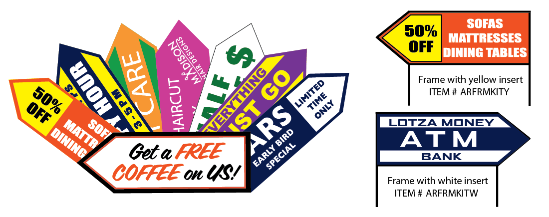 Our angle iron arrow kits have a simple and durable design. The frames are designed with easy slide in tabs so the signs are easily interchangable for all of your advertising needs. Call for information on custom shapes & sizes.